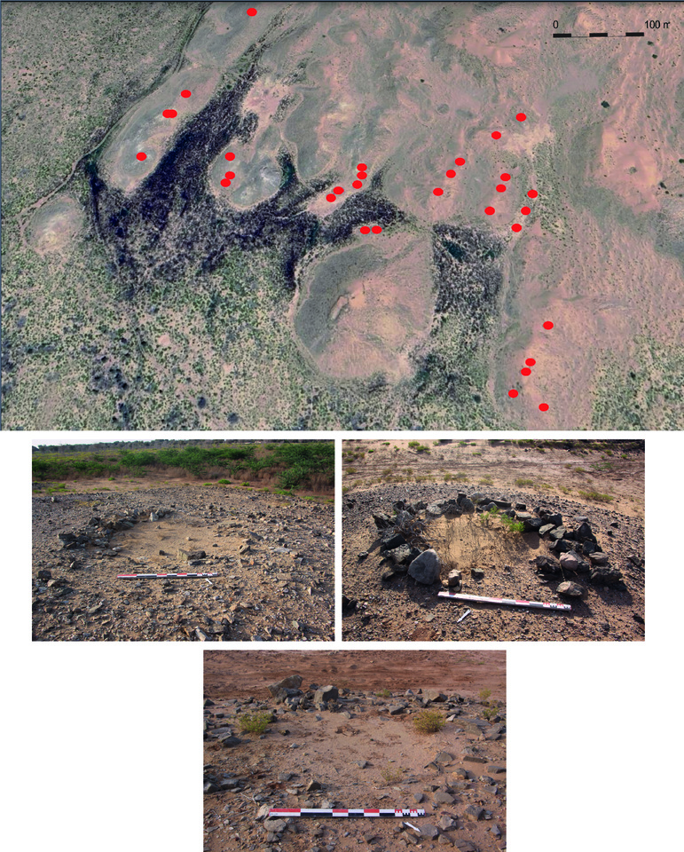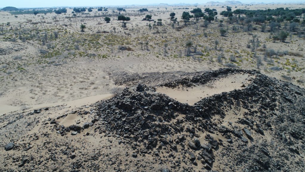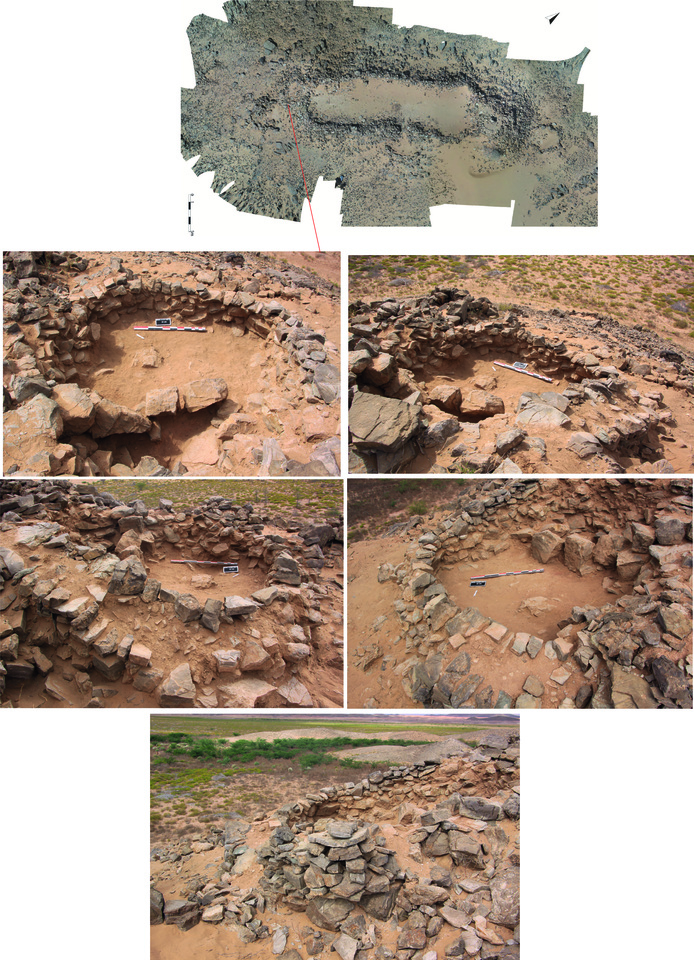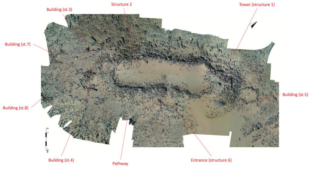 Enfin, il convient de noter que de petites structures circulaires ont été observées tout autour du site. Elles n’ont pas encore été testées et fouillées à ce jour, mais le matériel dispersé autour d’elles, notamment de la céramique et des outils en silex, correspond à des périodes anciennes, notamment l’âge du Fer, ainsi qu’à des périodes plus récentes. Ces structures devront être fouillées l’année prochaine pour déterminer leur fonction et leur datation.