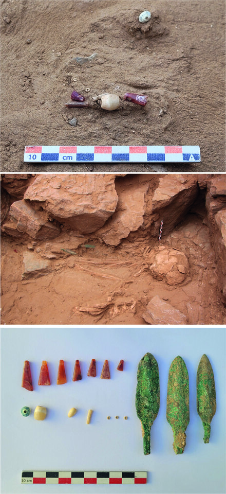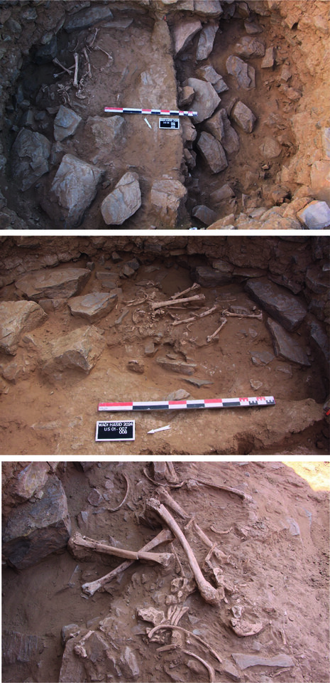 La phase finale d’occupation observée sur ce site correspond à une période tardive, aux VIe et VIIe siècles après J.-C., entre 578 et 654 après J.-C. Cela concerne la réutilisation de la tour à des fins funéraires, caractérisée par le dépôt d’un homme adulte plus haut dans le comblement. Malgré un pillage évident de ce dépôt, attesté par la grande dispersion des ossements, les études anthropologiques ont déterminé que sa position initiale était contractée.