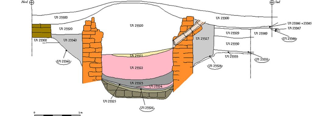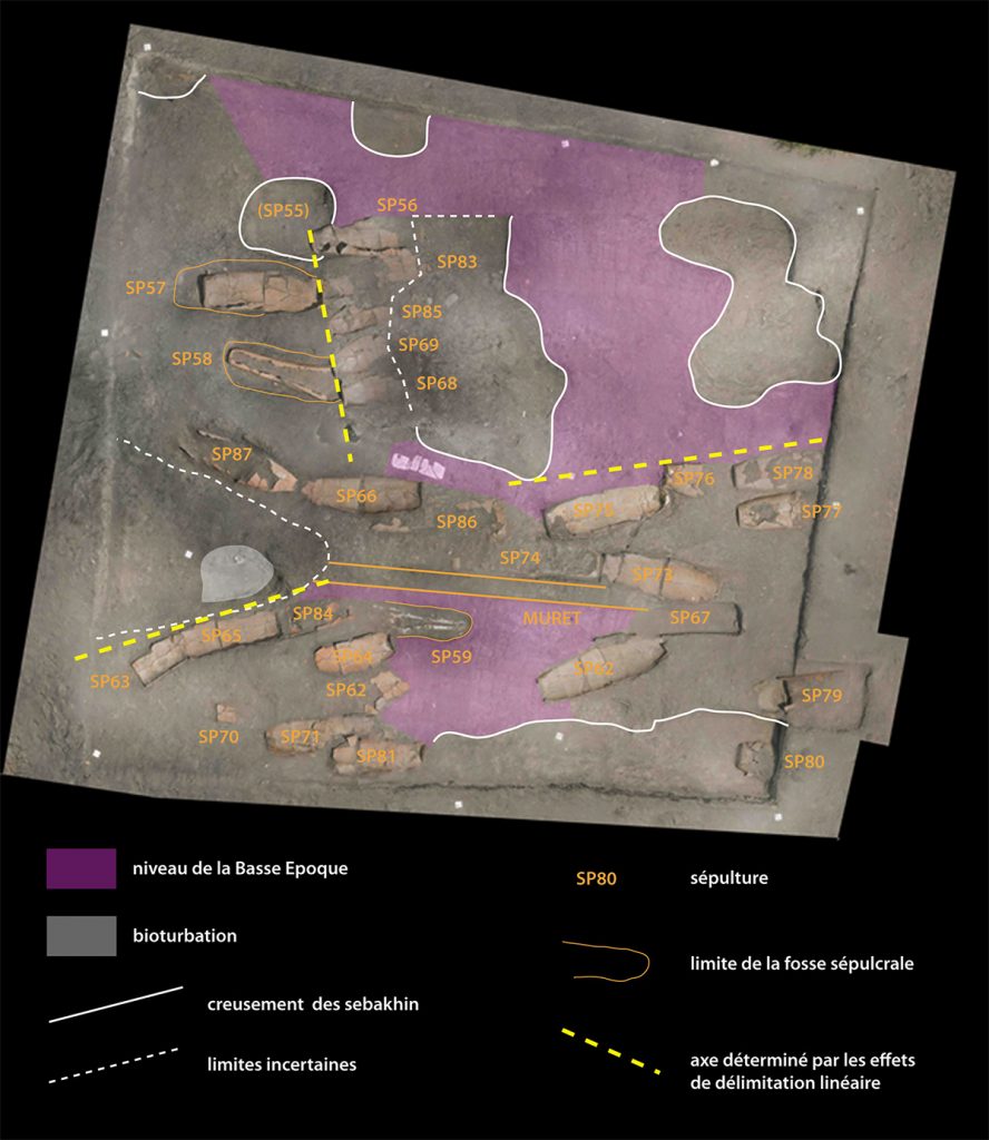 Les travaux dans la nécropole ont été menés dans trois zones différentes (P22-3, P22-4 et P22-5), révélant une stratigraphie complexe qui témoigne de plusieurs phases d’occupation du site :