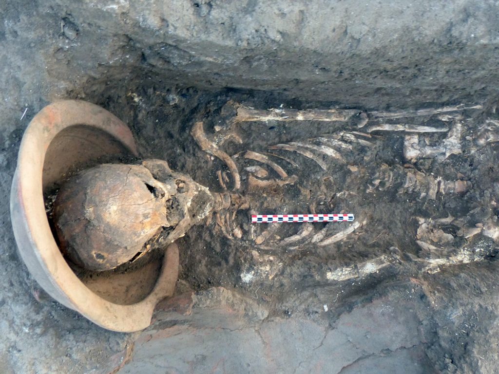 La zone P22-4 (environ 100 m²) a livré 30 sépultures d’époque romaine (Ier-IIe siècles apr. J.-C.). Les défunts étaient généralement inhumés dans des contenants formés de deux jarres mises bout à bout. Deux cas particuliers ont été relevés : une sépulture utilisant une cuve de sarcophage retournée comme couverture (le fond n’est pas construit), premier exemple de réutilisation d’un contenant que nous rencontrons, et une sépulture d’immature où une jarre était complétée par une céramique pour protéger les jambes et les pieds.