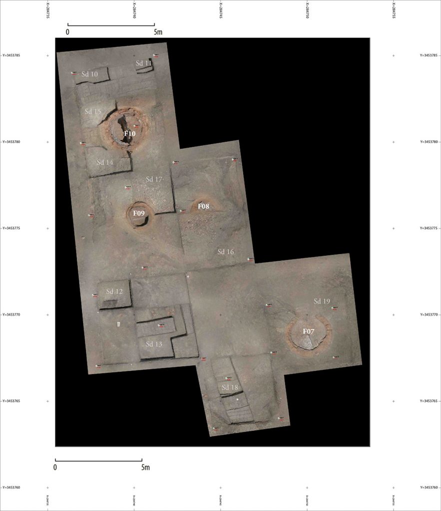 Quatre nouveaux fours (F07 à F10) ont été étudiés dans la partie nord du secteur. Les fours F07 et F10, les plus imposants (2,80 m et 2,50 m de diamètre), présentent un système de ventilation par tuyaux à cols d’amphores emboîtés. Les fours F08 et F09, plus petits (1,60 m de diamètre) et moins bien conservés, témoignent d’une simplification technologique qui pourrait indiquer un déclin de la production.